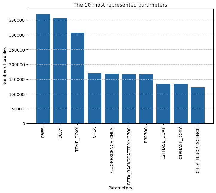 Each float has a number of sensors, so not all profiles contain the same parameters. It is interesting to see the number of parameters that exist and which are the most represented.